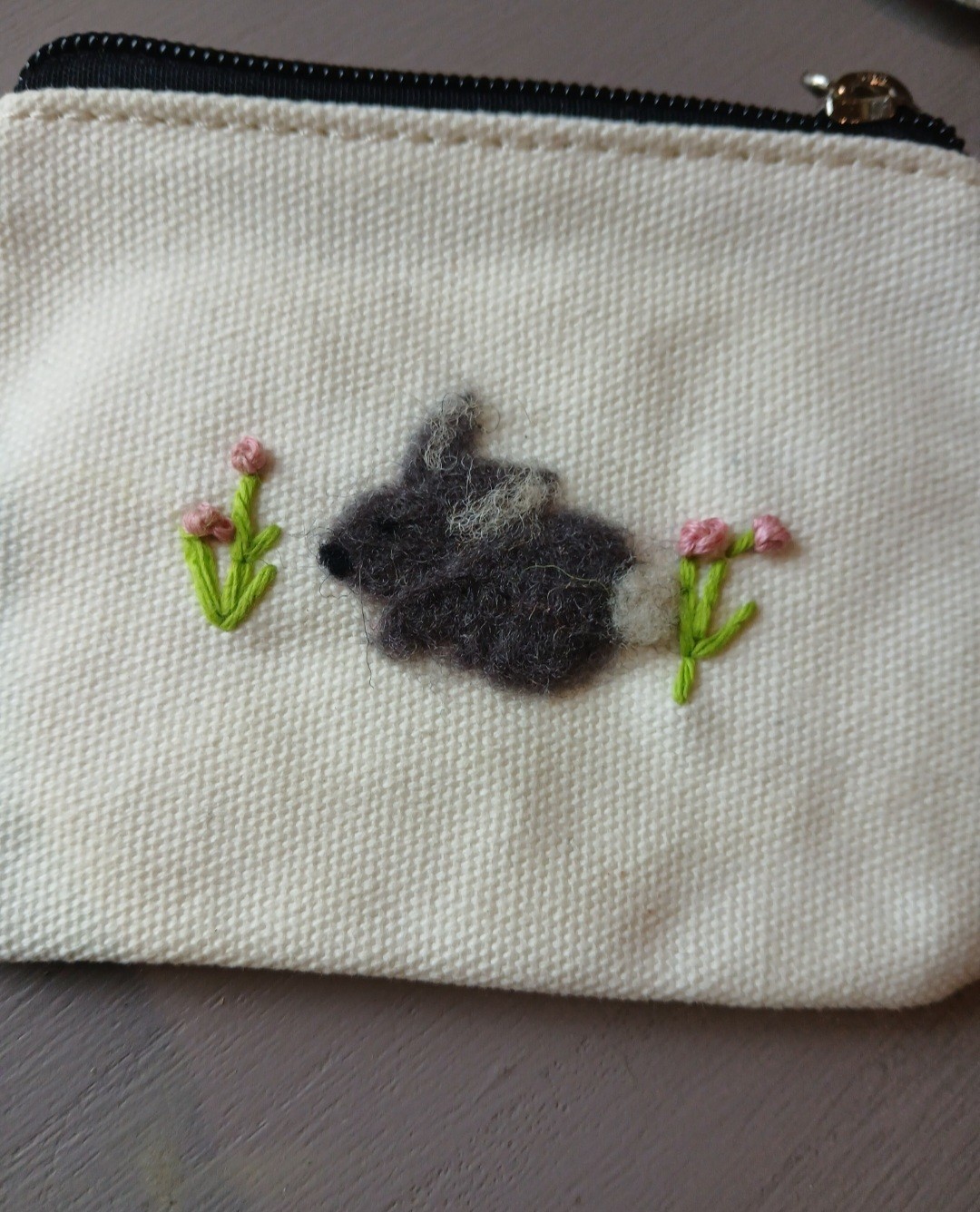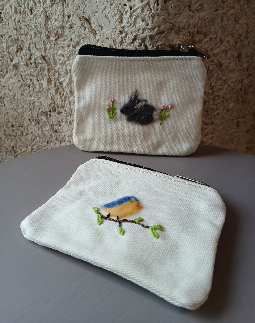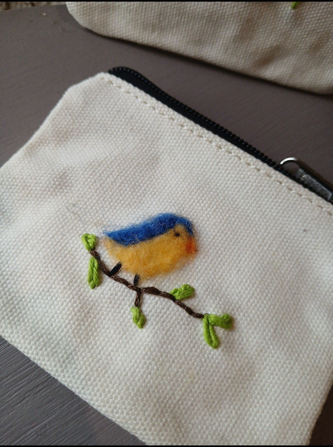 Porte monnaie en coton brodé en laine feutré à l'aiguille